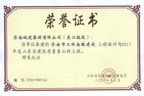 济南市二环南路建设工程(东二标段)被评为2017年度山东省建筑质量泰山杯工程