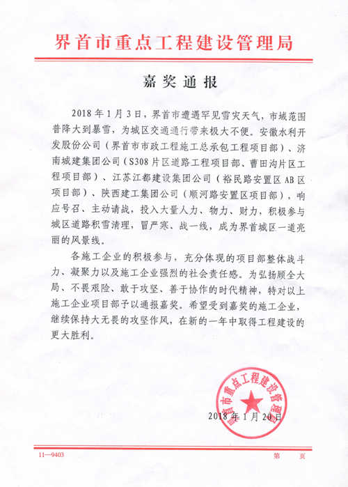 S308片区道路工程项目部荣获界首重点工程建设管理局嘉奖通报