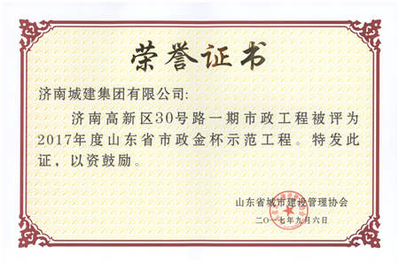 济南高新区30号路一期市政工程被评为2017年度年度山东省市政金杯示范工程