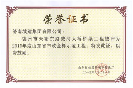 德州市天衢东路减河大桥桥梁工程被评为2015年度山东省市政金杯示范工程