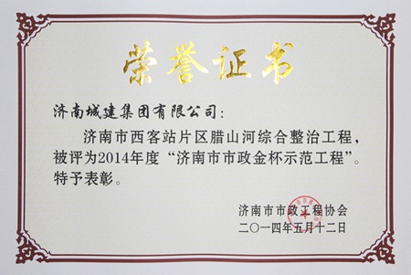 济南市西客站片区腊山河综合整治工程被评为2014年度济南市市政金杯示范工程